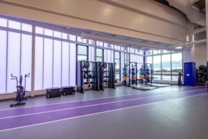 Additionally, the facility design required an inventive, eye-catching aesthetic, intended to promote a playful environment and infuse visitors with community spirit. The exterior further necessitated the use of materials with the versatility to apply unique color options, in order to match with customized interior design choices. The project prioritized incorporating the school district’s signature purple color, which was integrated throughout indoor areas such as the indoor track and bathroom tile.