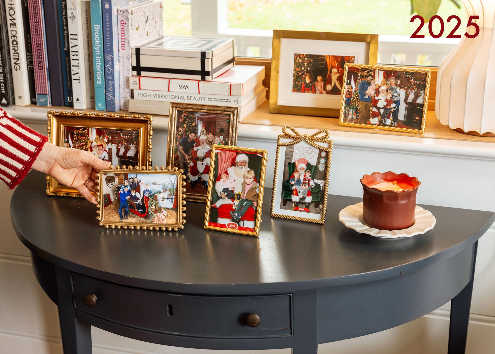 In 2023 (and last year), I had our Santa photos all on this piece, but I love them in the gold frames more (they started in white frames at the mountain house, which worked well there).