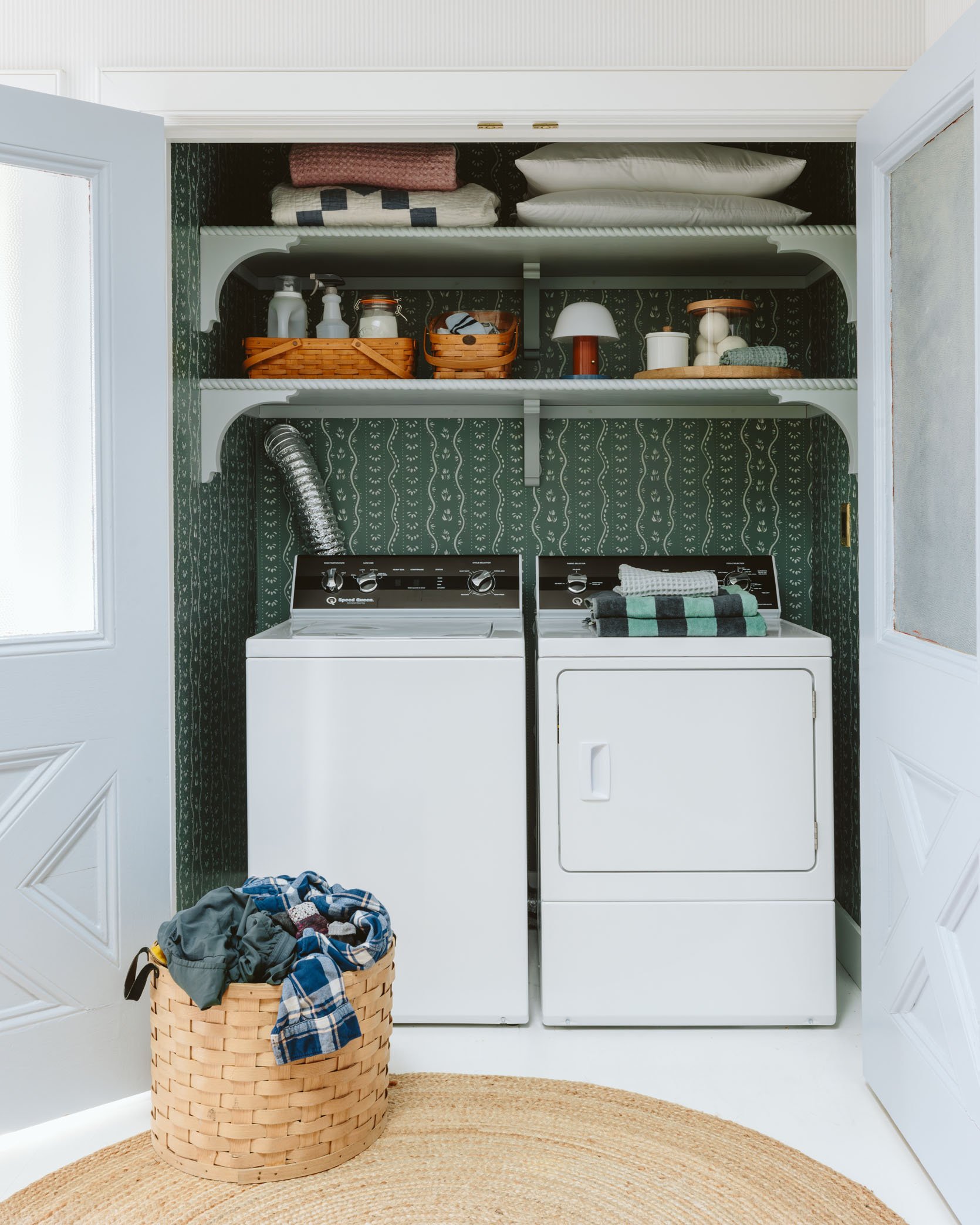 Ah, my laundry closet, which is painfully cute and gets so much use. This was my first DIY wallpaper job (pre-pasted FTW) and so satisfying. This is also where I revealed my love for “dumb” appliances (i.e., the Speed Queen that is historically the most long-lasting washer, that cleans the best despite looking so old school). She’s a solid appliance! I also love the little rope detail on the shelves.
