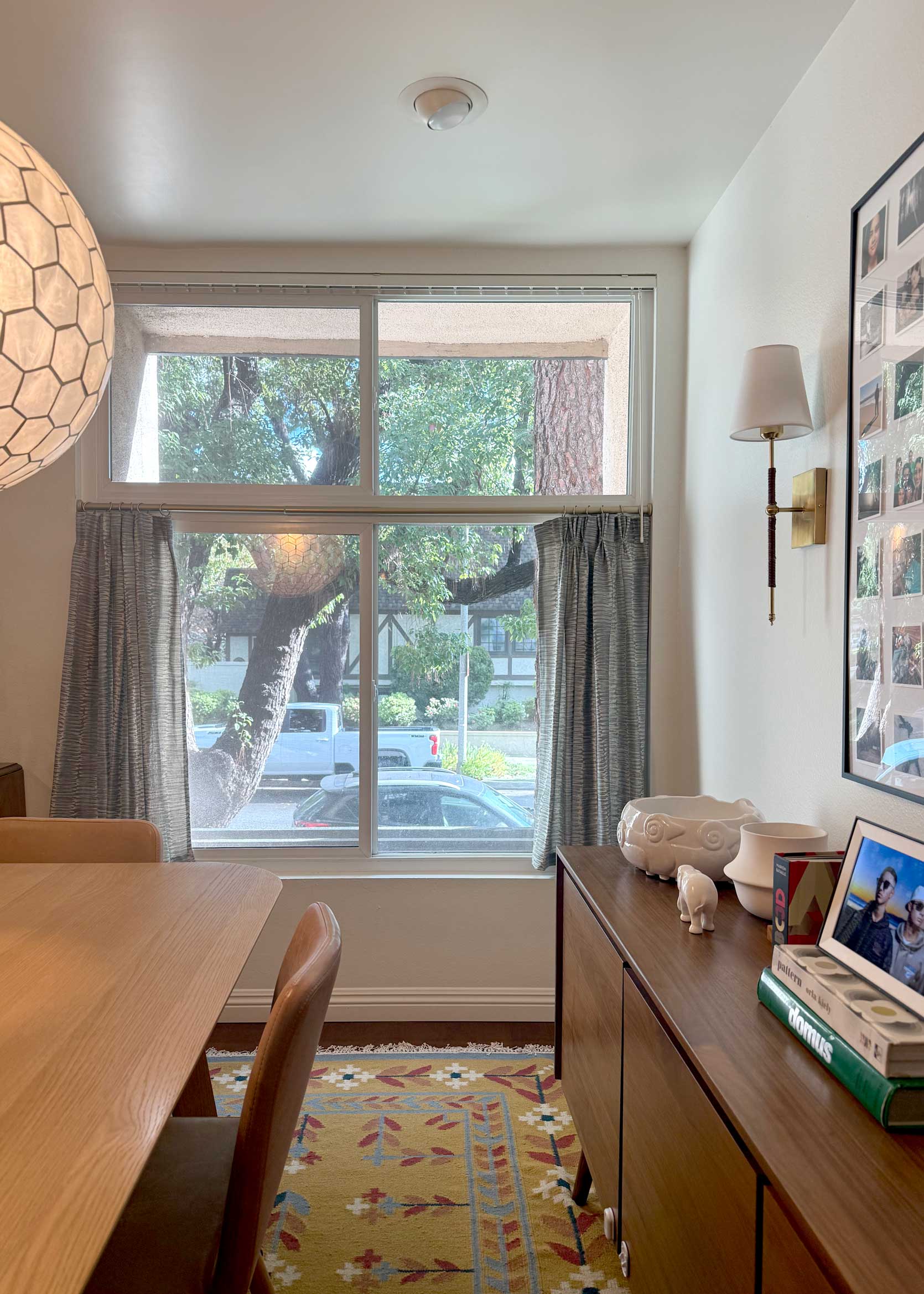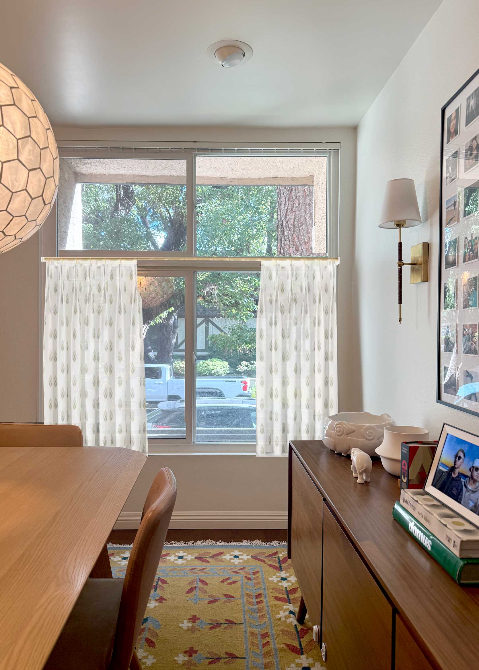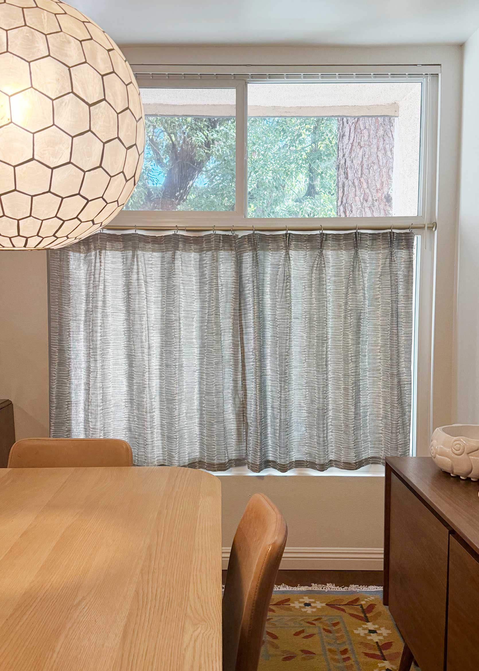Before settling on this design years ago, I contemplated doing curtain panels, but I really wanted to try something different. Not to mention the ceiling height in my dining room is fairly low, and I thought long drapes would overpower the space that already had a ton of large-scale furniture in it. That, and our home’s perimeter consists of at least a dozen old-growth camphor and pine trees, which means that even though our windows are gargantuan, they do not let in much light. Blocking any of that sunlight, especially from the top part of the window, felt criminal.
