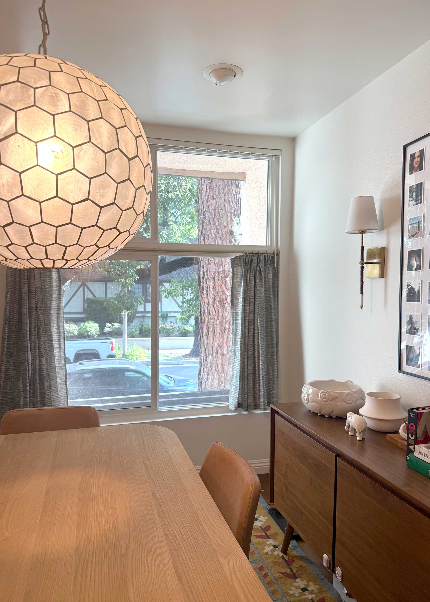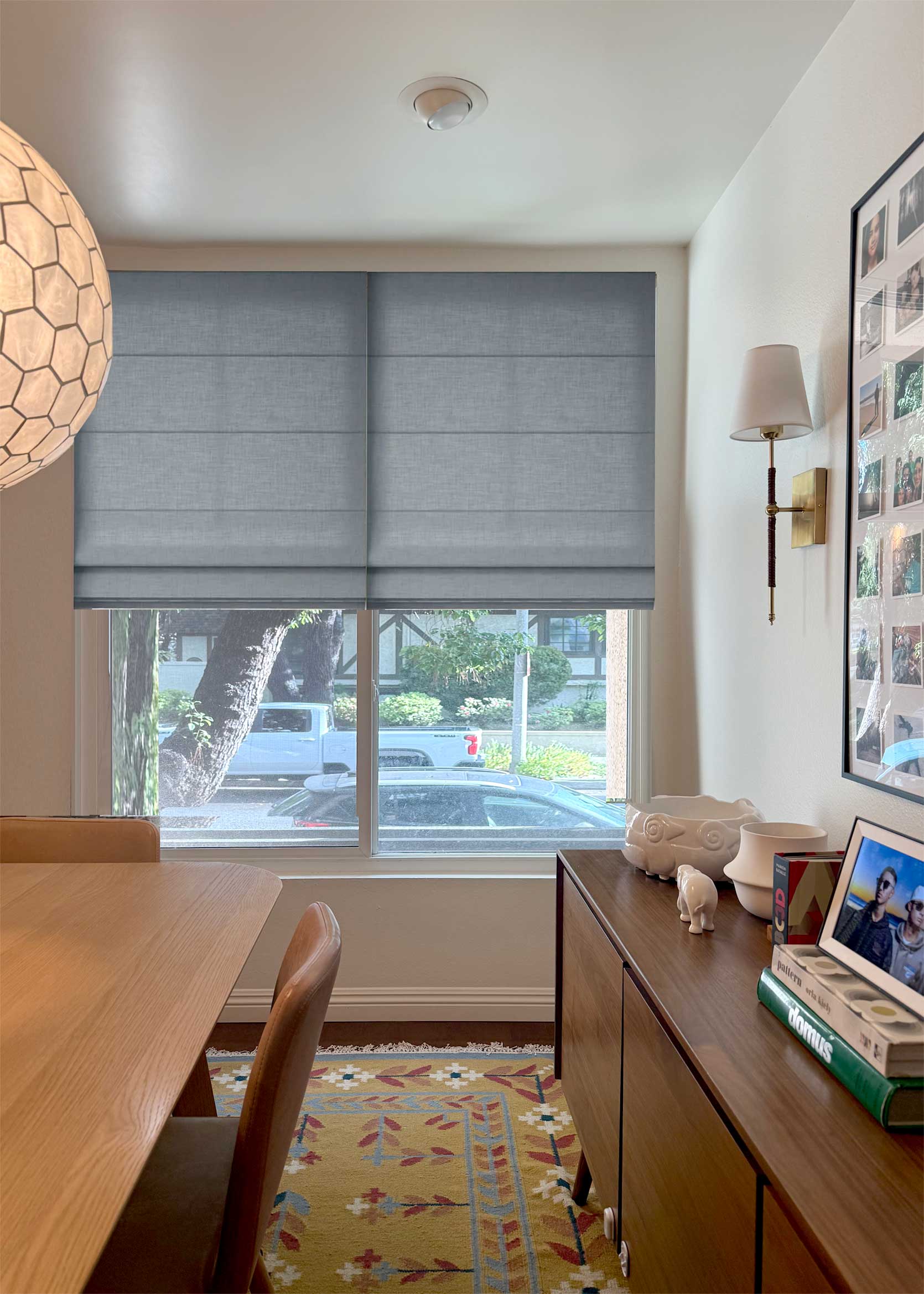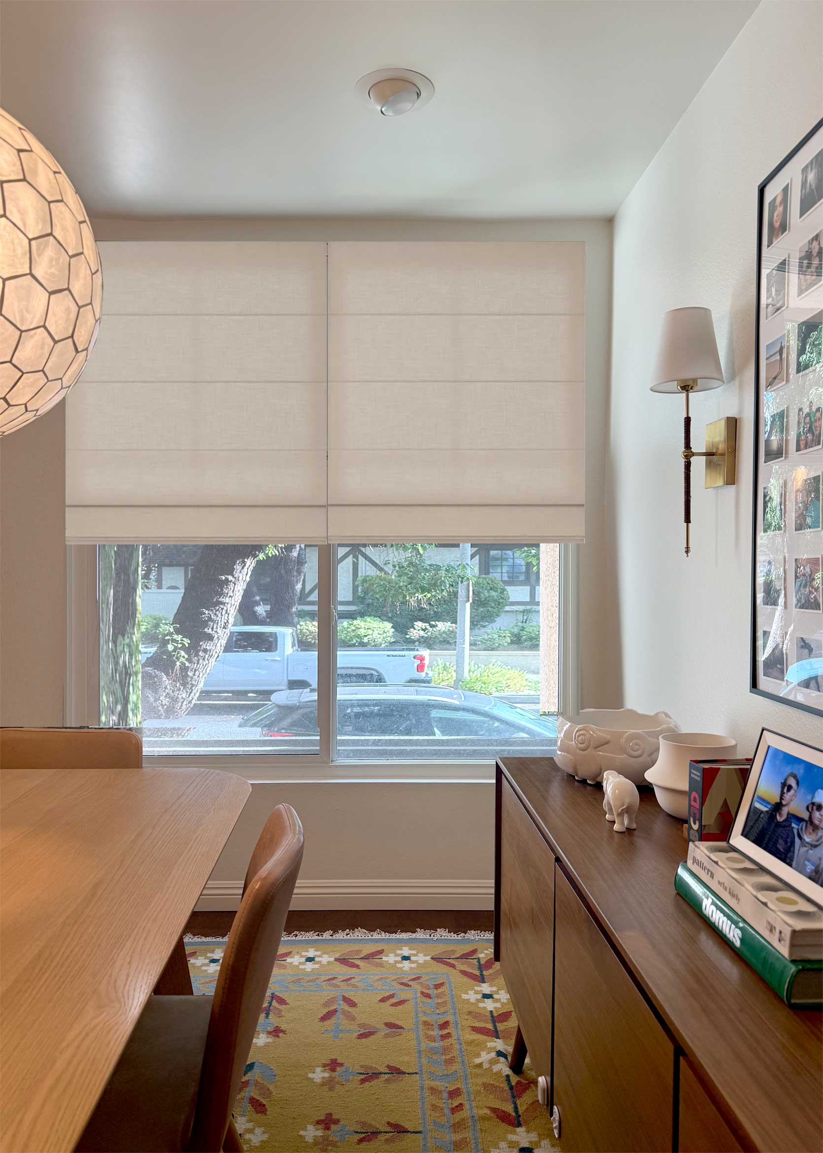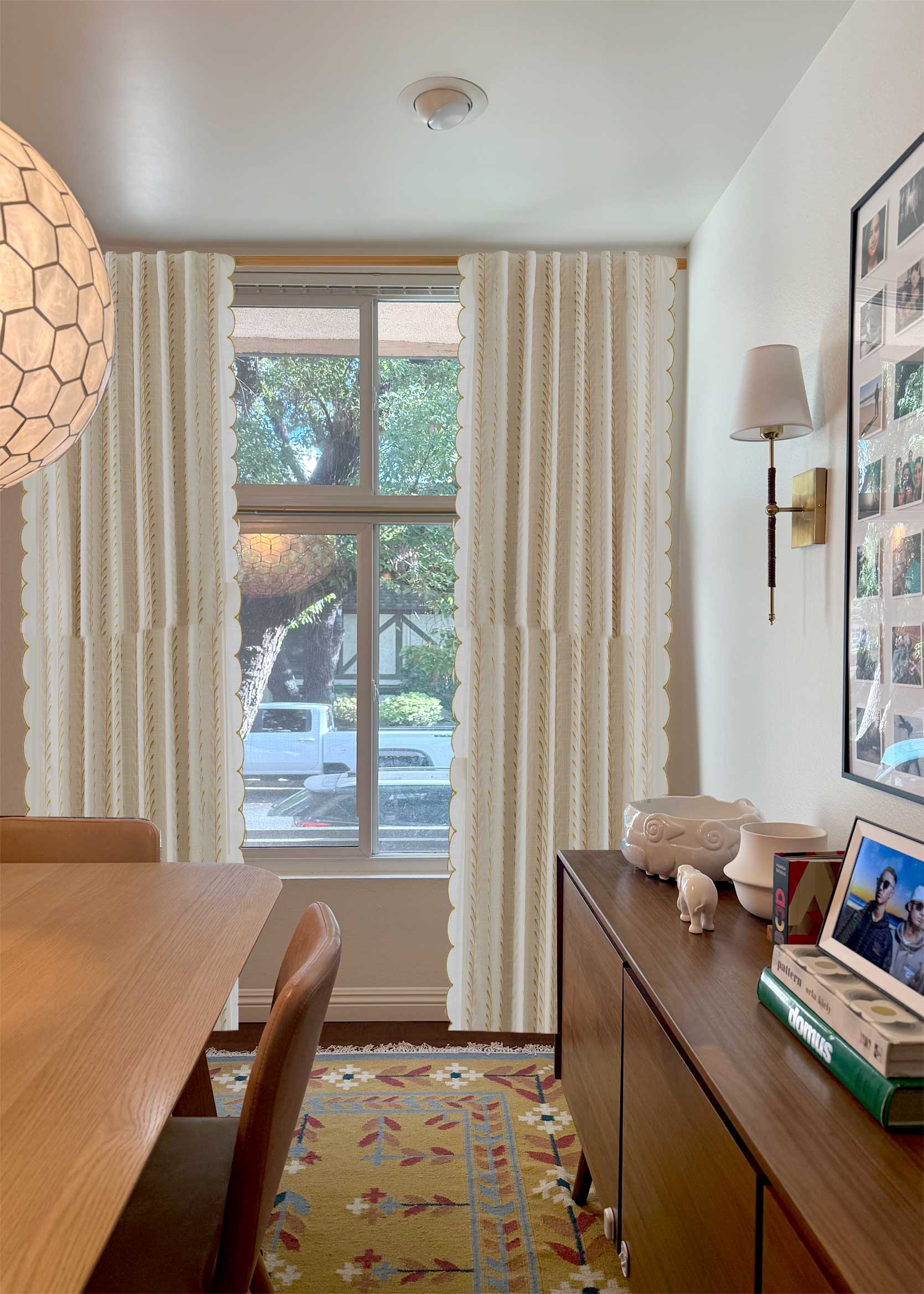 Before settling on this design years ago, I contemplated doing curtain panels, but I really wanted to try something different. Not to mention the ceiling height in my dining room is fairly low, and I thought long drapes would overpower the space that already had a ton of large-scale furniture in it. That, and our home’s perimeter consists of at least a dozen old-growth camphor and pine trees, which means that even though our windows are gargantuan, they do not let in much light. Blocking any of that sunlight, especially from the top part of the window, felt criminal.