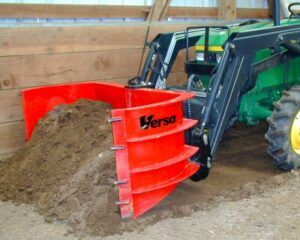 For outbound loads, skid loaders, tractor loaders, and wheel-loaders commonly use buckets to fill trucks, roll-off containers, or bins with processed recyclables or residual waste. The clam shell design of the Versa Bucket provides more efficient unloading by not having to tip bucket down to discharge the material allowing for a higher discharge height. This allows the operator to visibly see when the bucket is empty, saving time and equipment wear by not having to shake and or tip the bucket down.