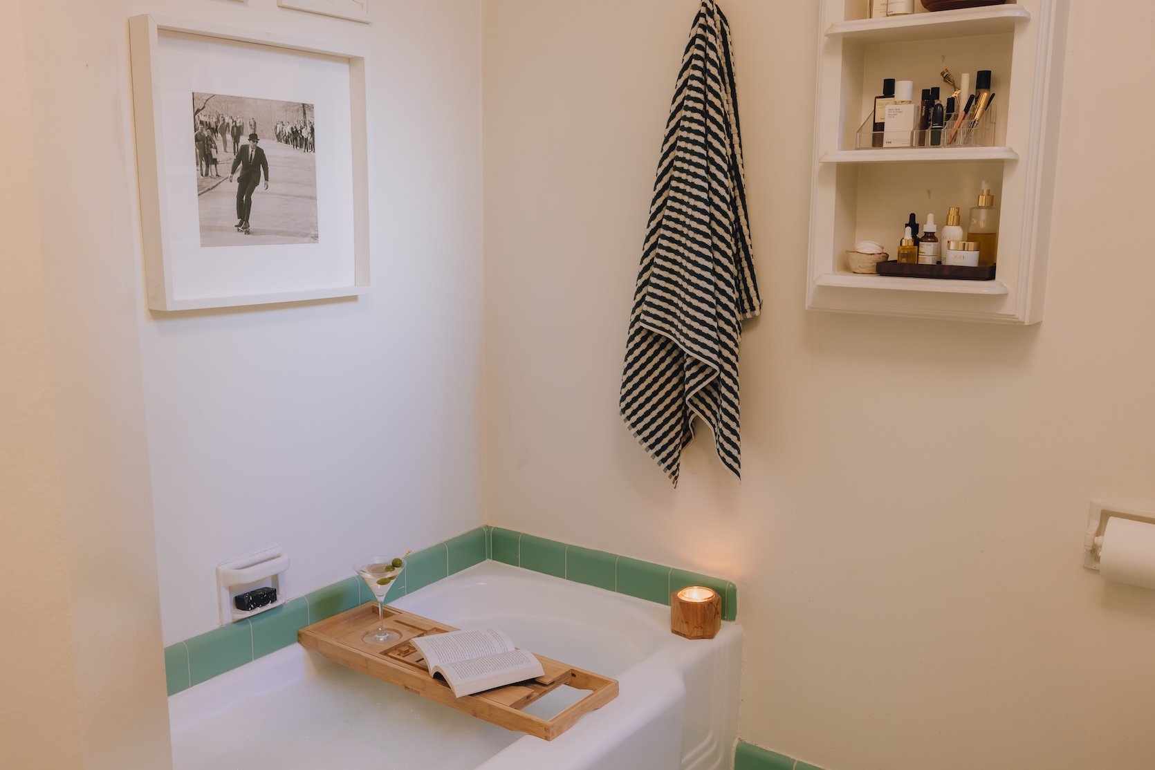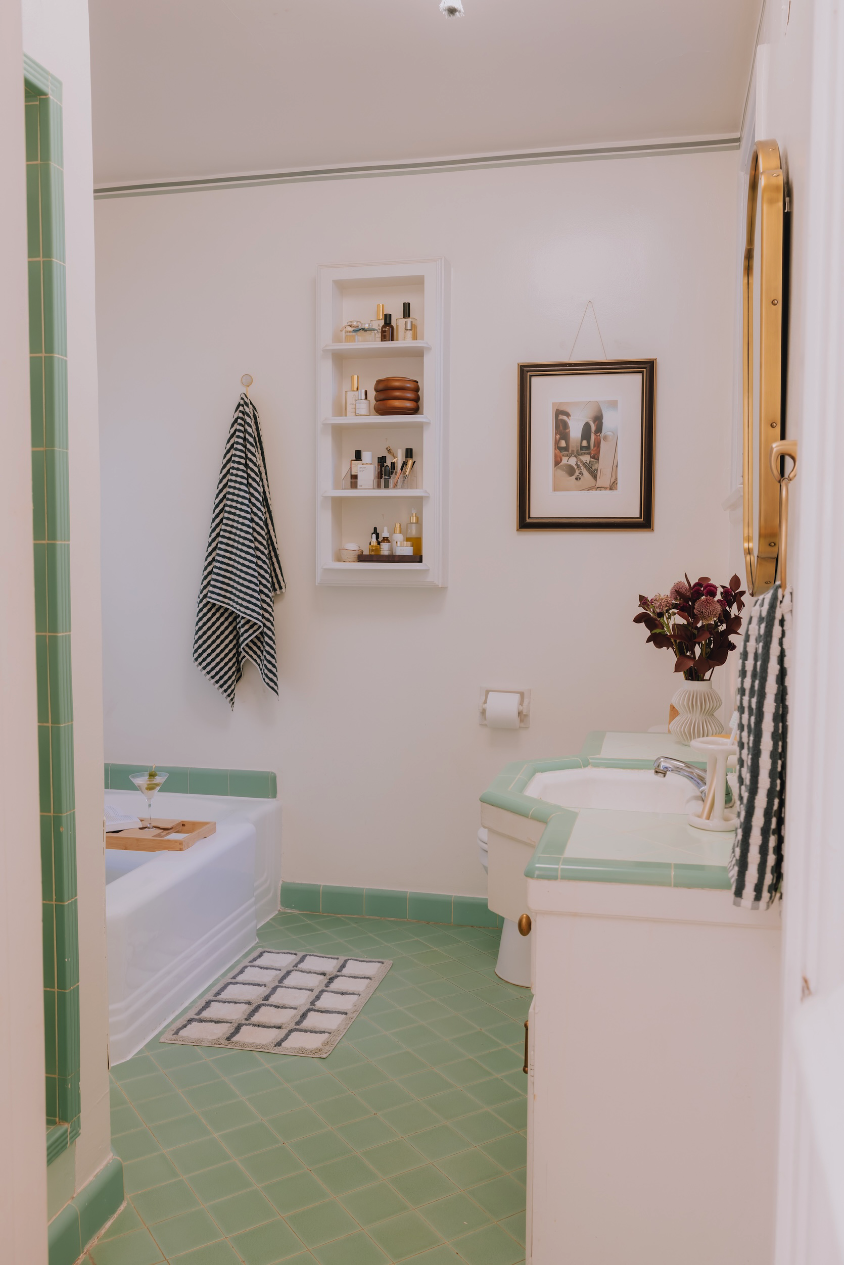 That tile!! The little shelf!! THE TUB! It’s all so adorable. The only wonky thing is the fact that that cabinet just doesn’t close all the way (maybe a new 2026 design trend??) The green vintage tile really just sings – I actually found the perfect wallpaper I was going to install but like I said, it ultimately just ended up not being worth it for the cost, effort and removal. So I cut my losses, and instead came up with some affordable, easy swaps that would make the space feel like mine without breaking the bank or having to spend hours undoing it upon move out. And they were all totally worth it.