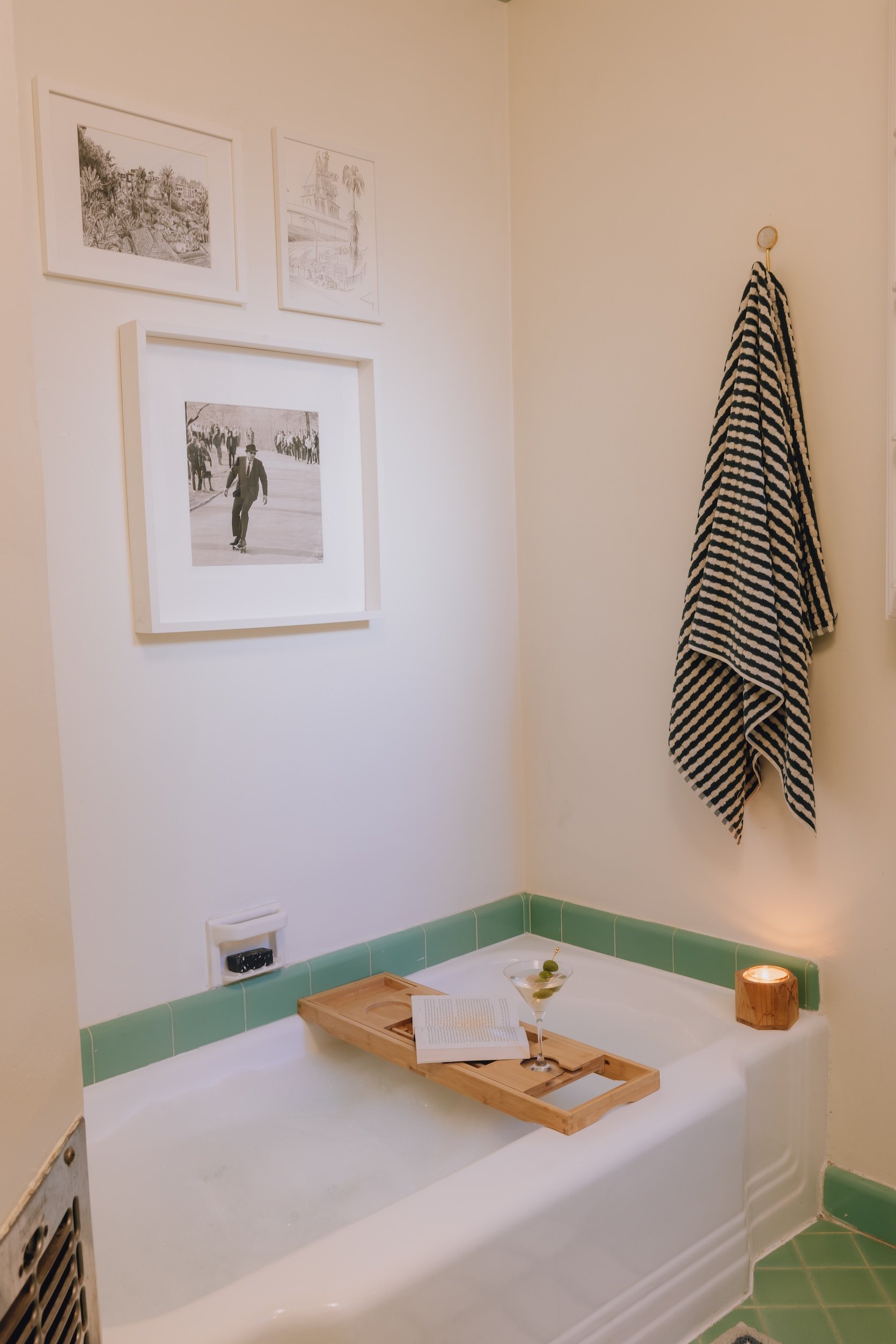 The art pieces above the tub are some of my absolute favorites. The skateboard guy I found at Market Market in Palm Springs (if you haven’t been – GO!), the top right is by Mucci (who I found at the Laguna Beach Sawdust Festival and have now put his artwork in 3 of the rooms in my apartment!), and then the top left is actually from my Hollywood studio (it’s a sketch of the view of the Chateau Marmont by the Max Gooding Co).