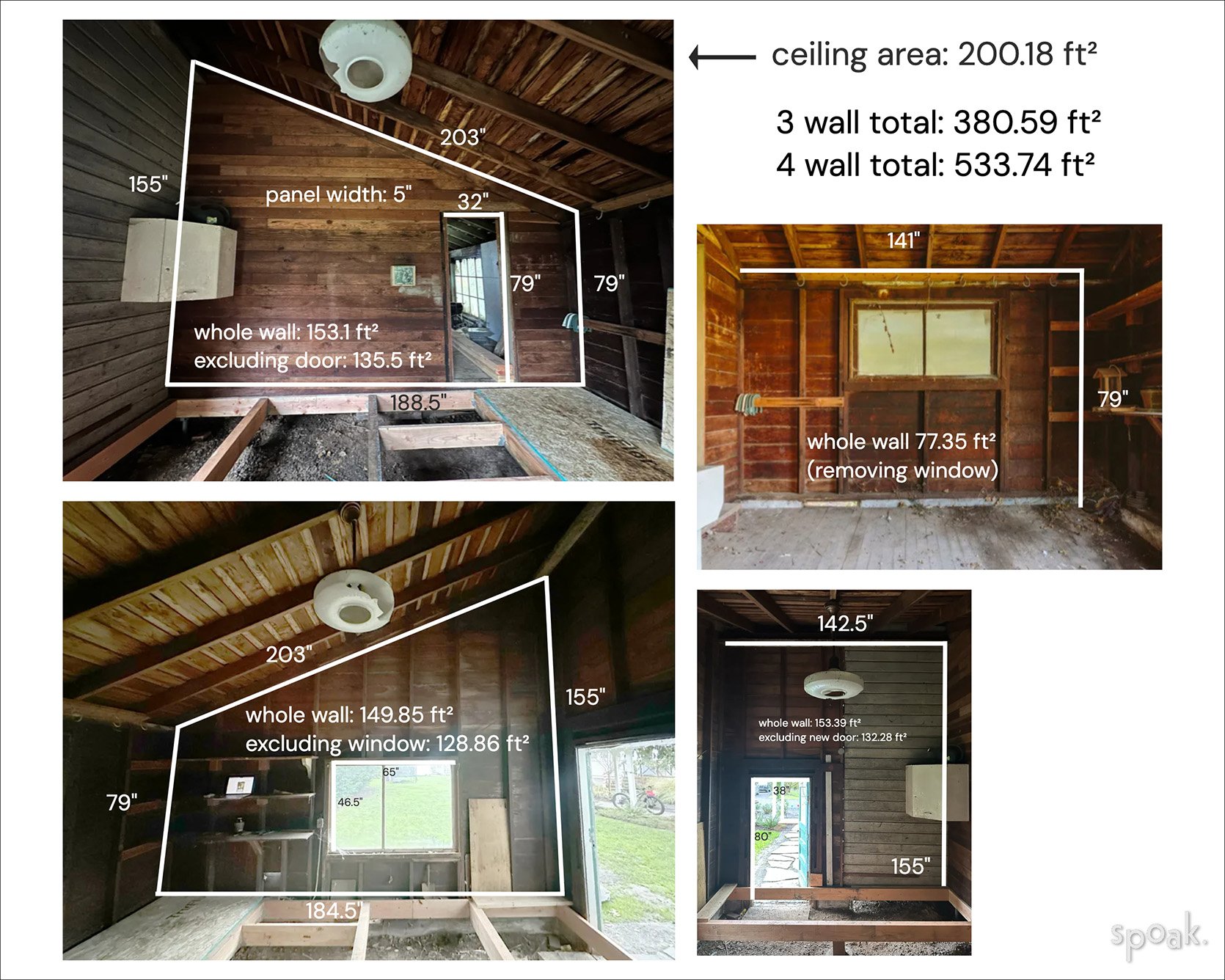 The existing paneled wall is about 153 ft² (minus the door, it’s about 135). If we’re able to match that wall and panel the remaining three sides, we’ll need about 380 ft² with overage. If we include the ceiling, we’ll need to add another 200 ft² to the order (plus a little overage). If we redo the entire room in inexpensive paneling or if we’re unable to match the existing and want to start over with all matching reclaimed, all in, we need roughly 735 ft² (so let’s call it 750ft²). So to recap, just the three walls and ceiling would be around 600ft², but the entire room and ceiling would be 750ft².